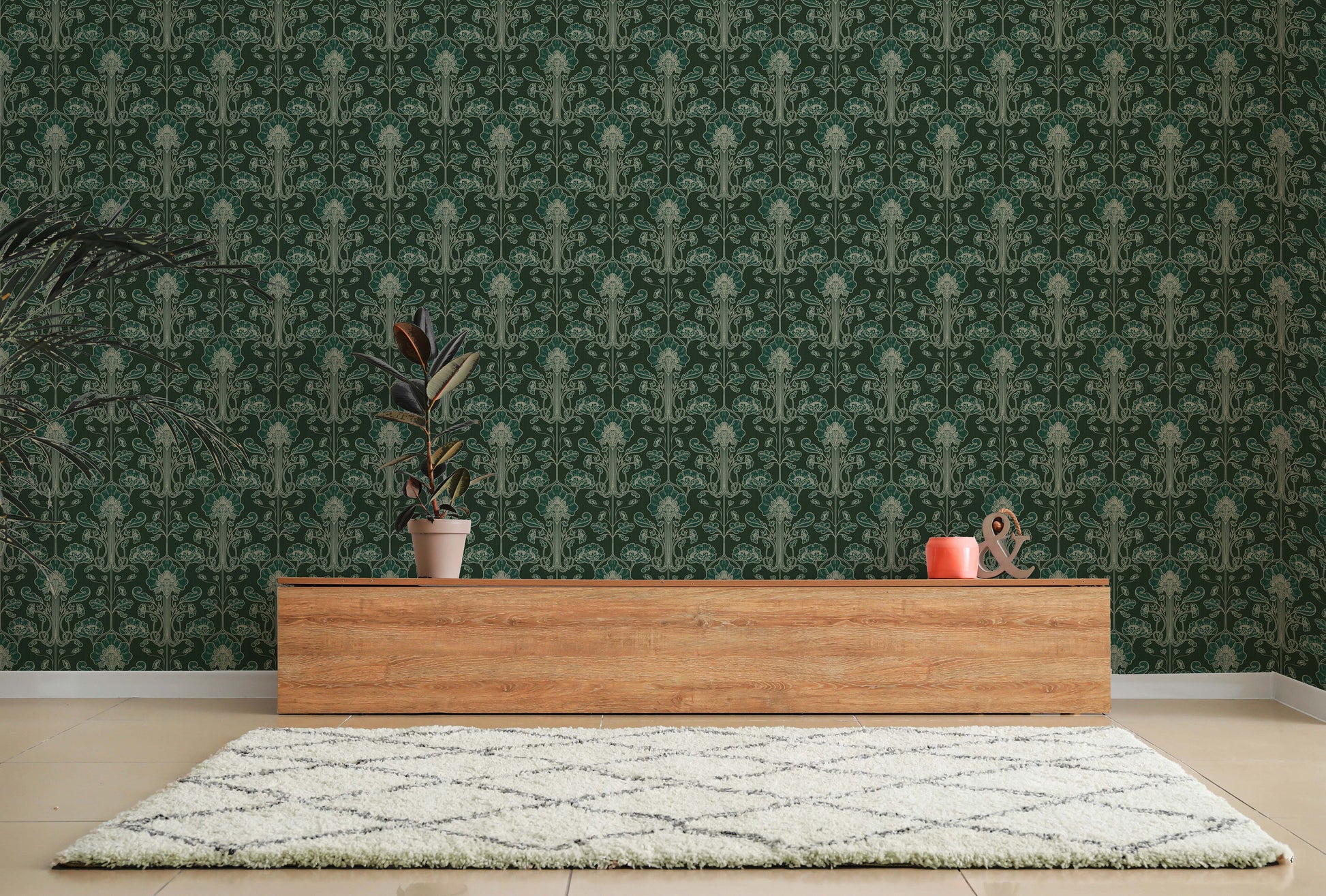 Art Deco Damask, is a damask inspired by the old wallpapers of the past. All motifs were hand drawn in Old Town Pasadena.
