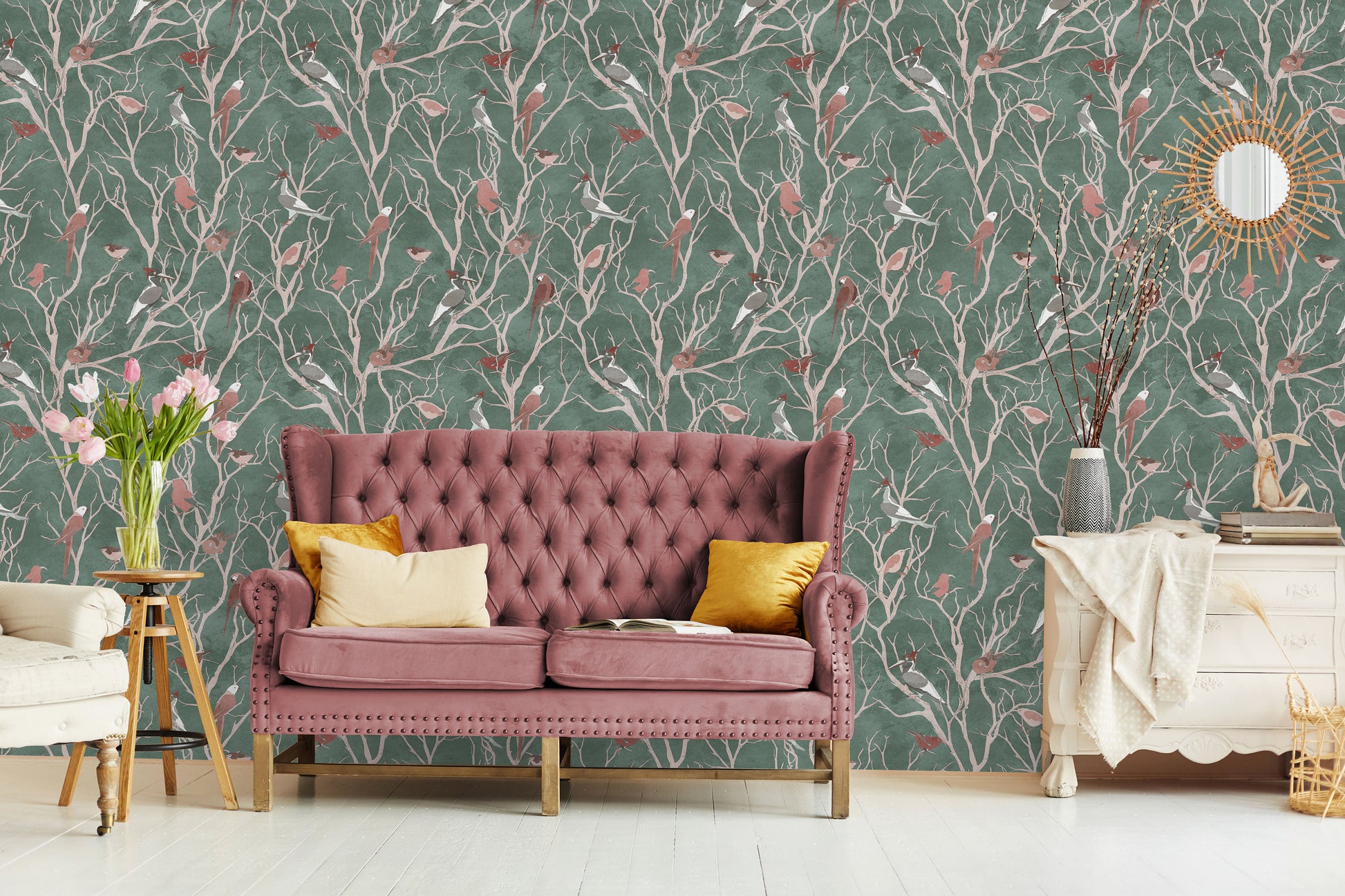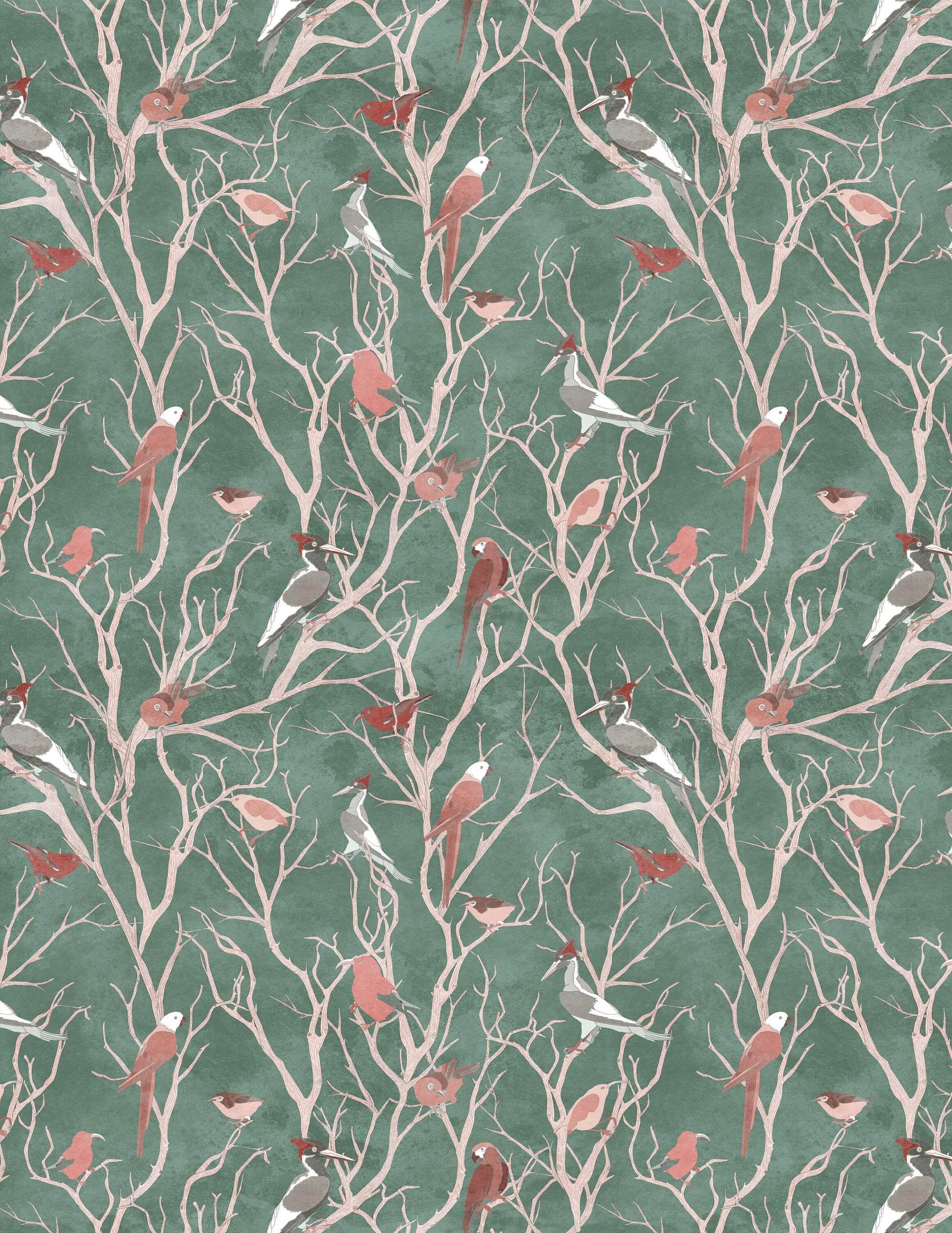 Birds of time is a collage of extinct birds as of 2021 sitting on leafless trees. All motifs were hand drawn in Old Town Pasadena.