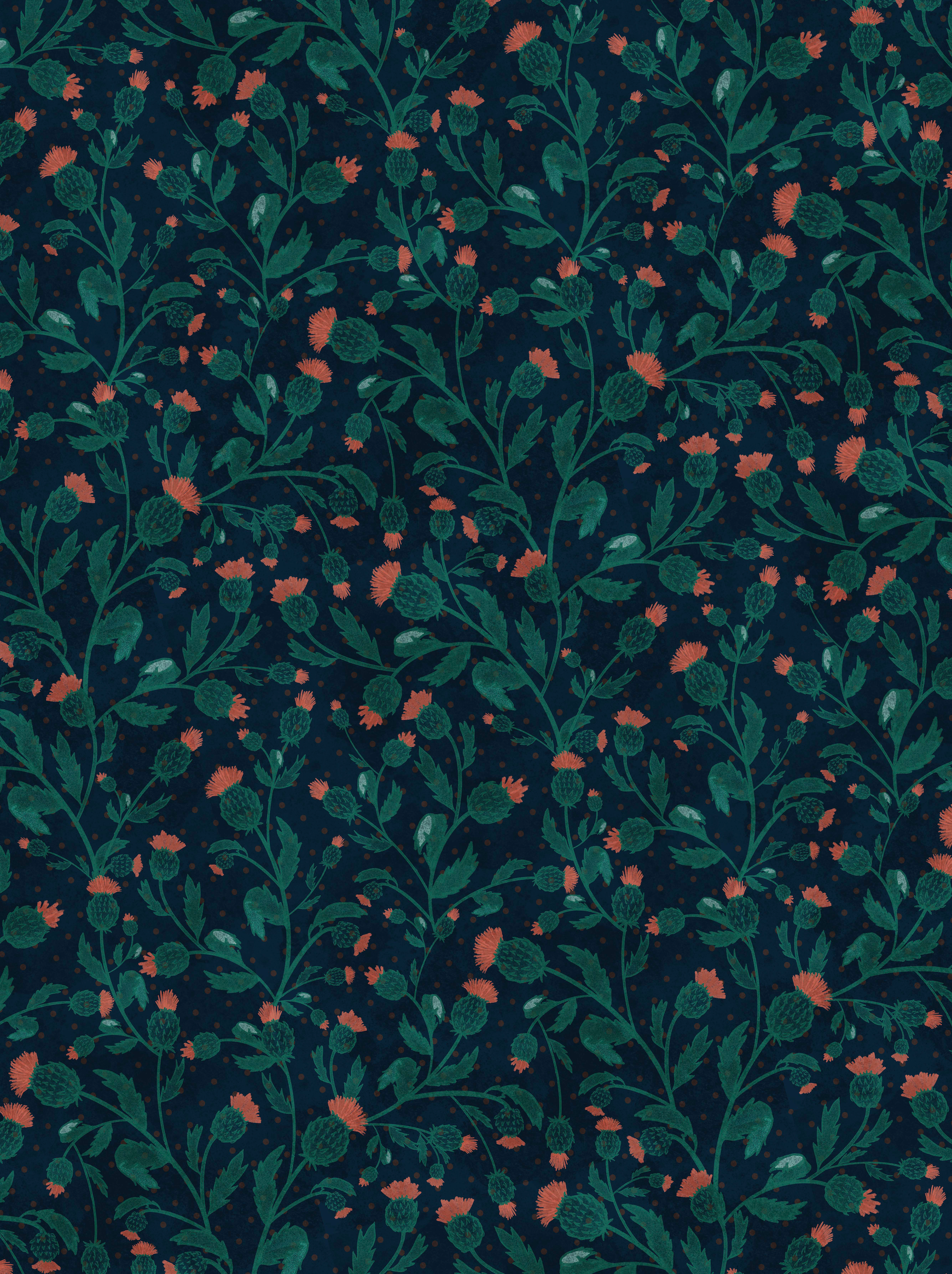 Playful all over of thistles, the flower of the Adriatic. It's another homage to the homeland, Croatia. Repeats every 18" All wallpaper has a 1/4 inch overlap to make for an easy installation EXCEPT for the Grasscloth, this material has zero overlap.
