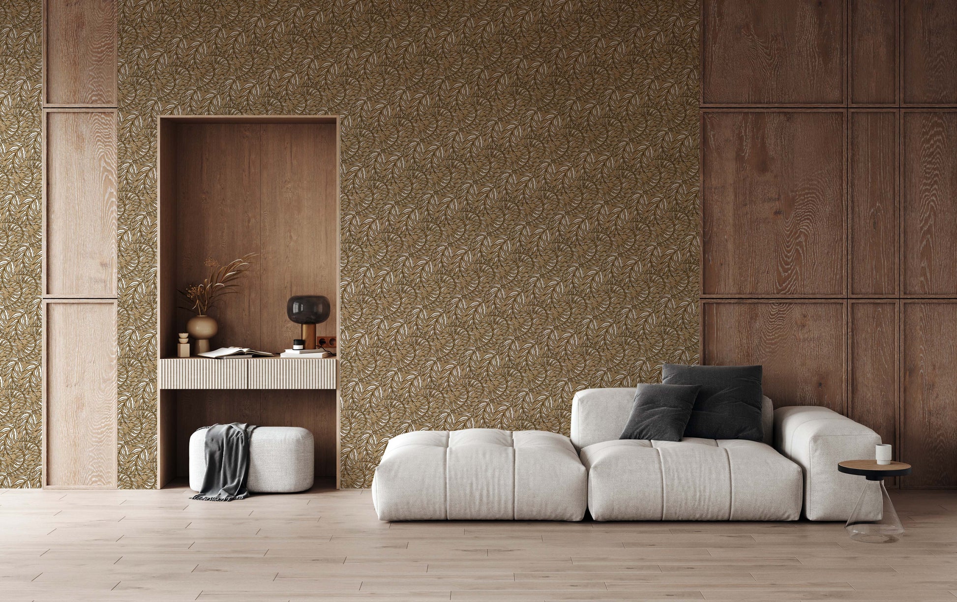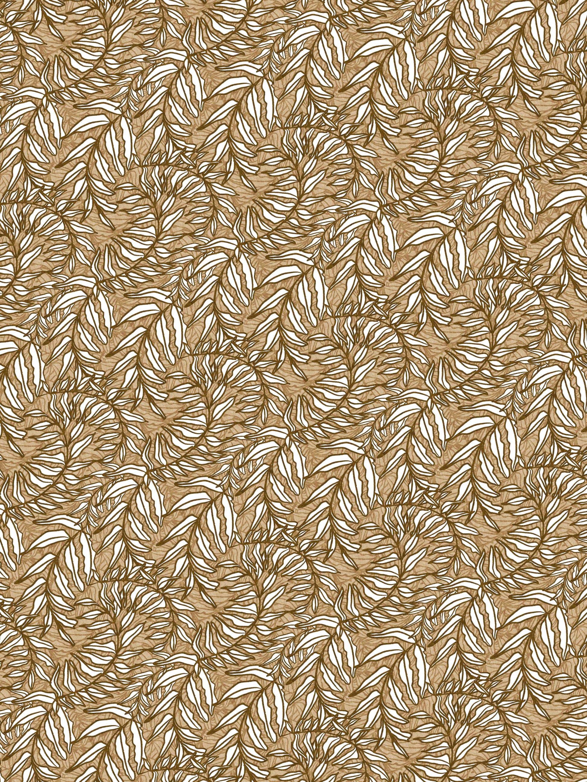 Line drawing of spiraled leaves to create a geometric all over pattern. Repeats every 18" All wallpaper has a 1/4 inch overlap to make for an easy installation EXCEPT for the Grasscloth, this material has zero overlap.