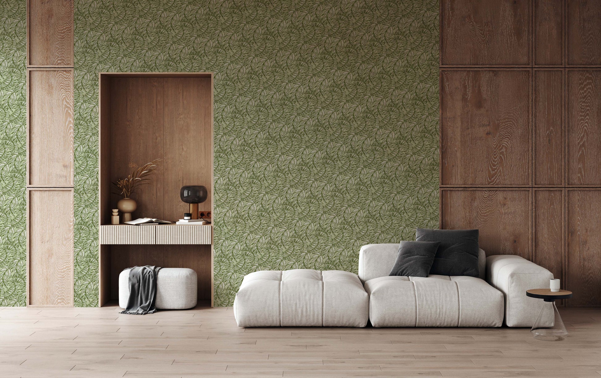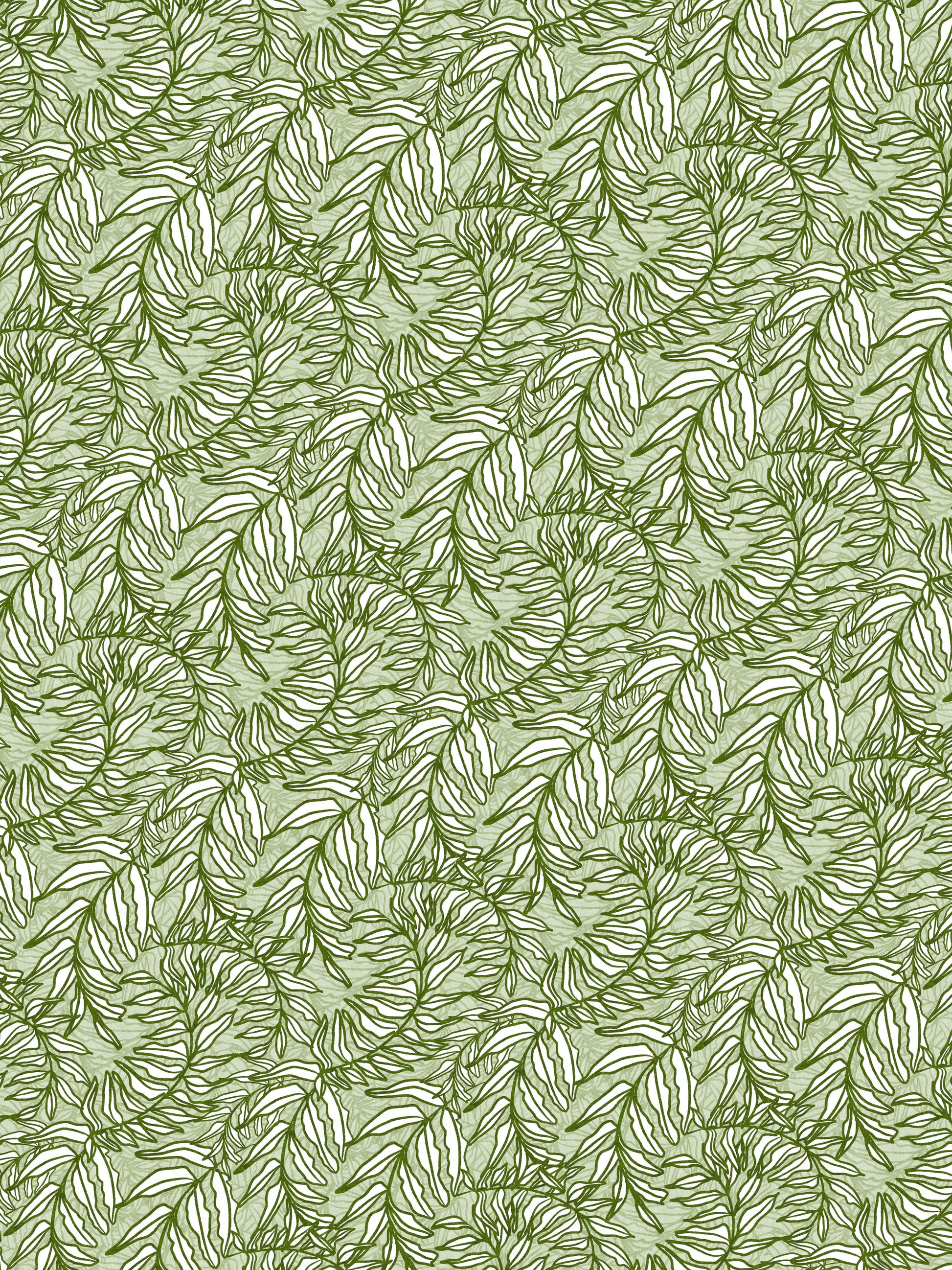 Line drawing of spiraled leaves to create a geometric all over pattern. Repeats every 18" All wallpaper has a 1/4 inch overlap to make for an easy installation EXCEPT for the Grasscloth, this material has zero overlap.