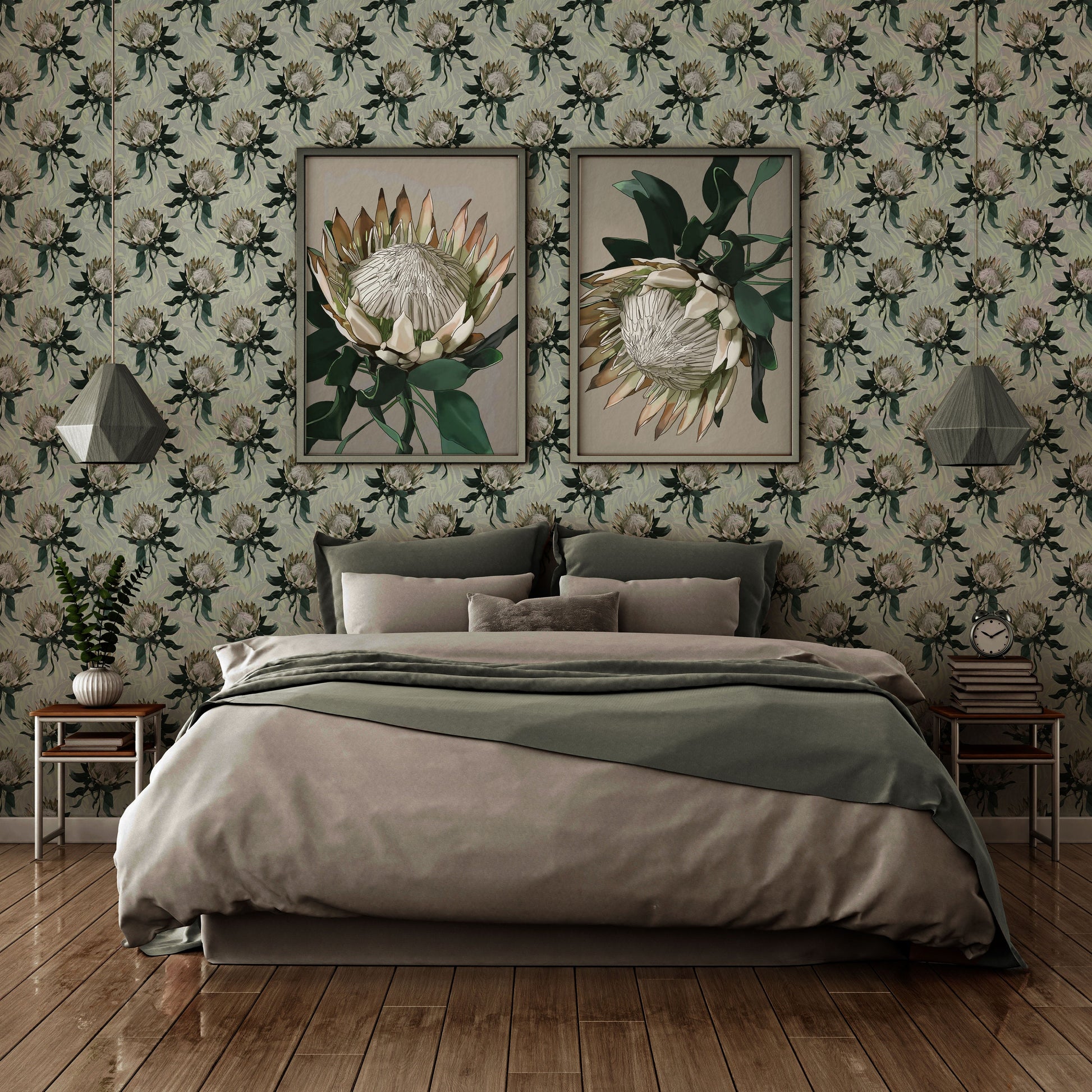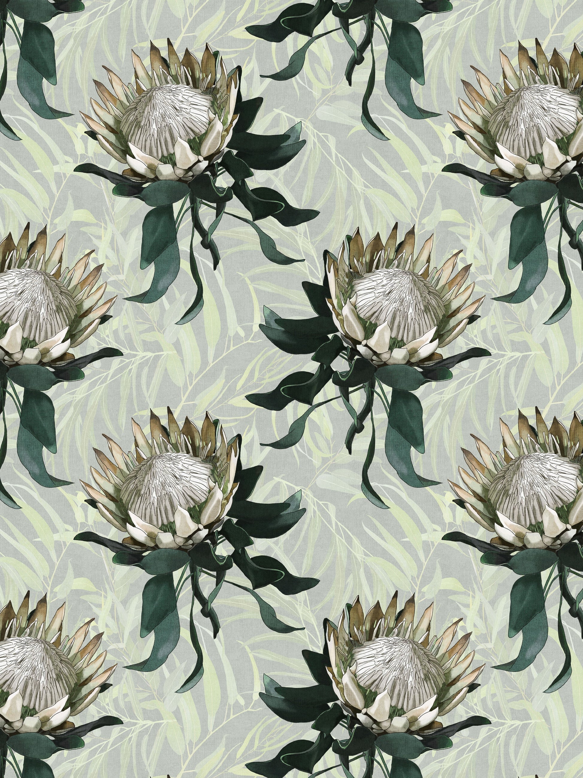 Empress Protea with a eucalyptus repeat in the background. All hand drawn in Old Town, Pasadena. Repeats every 20"