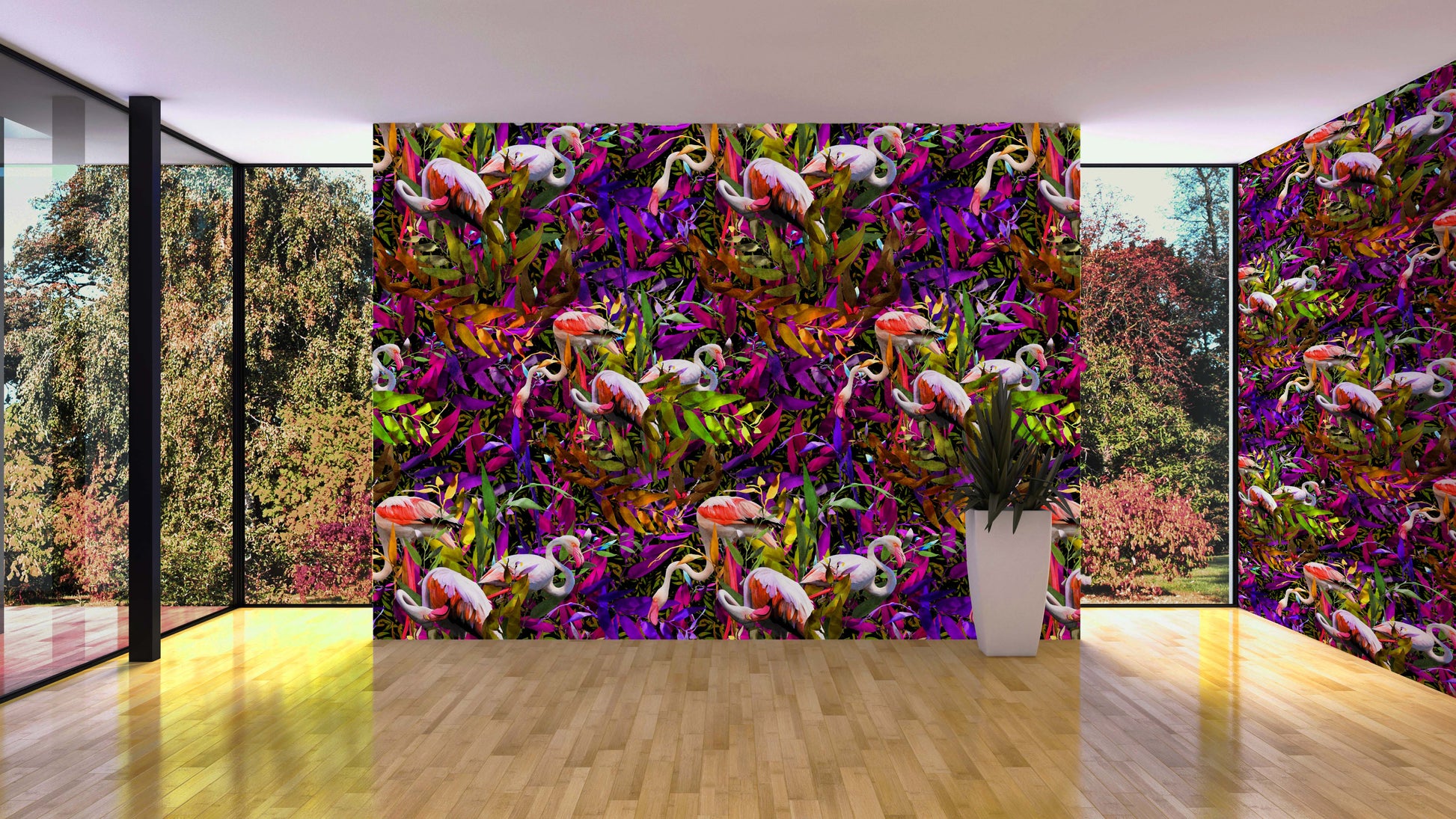 Flamingos is a hyperrealistic wallpaper of flamingos in a lagoon. All motifs were hand drawn in Old Town Pasadena.
