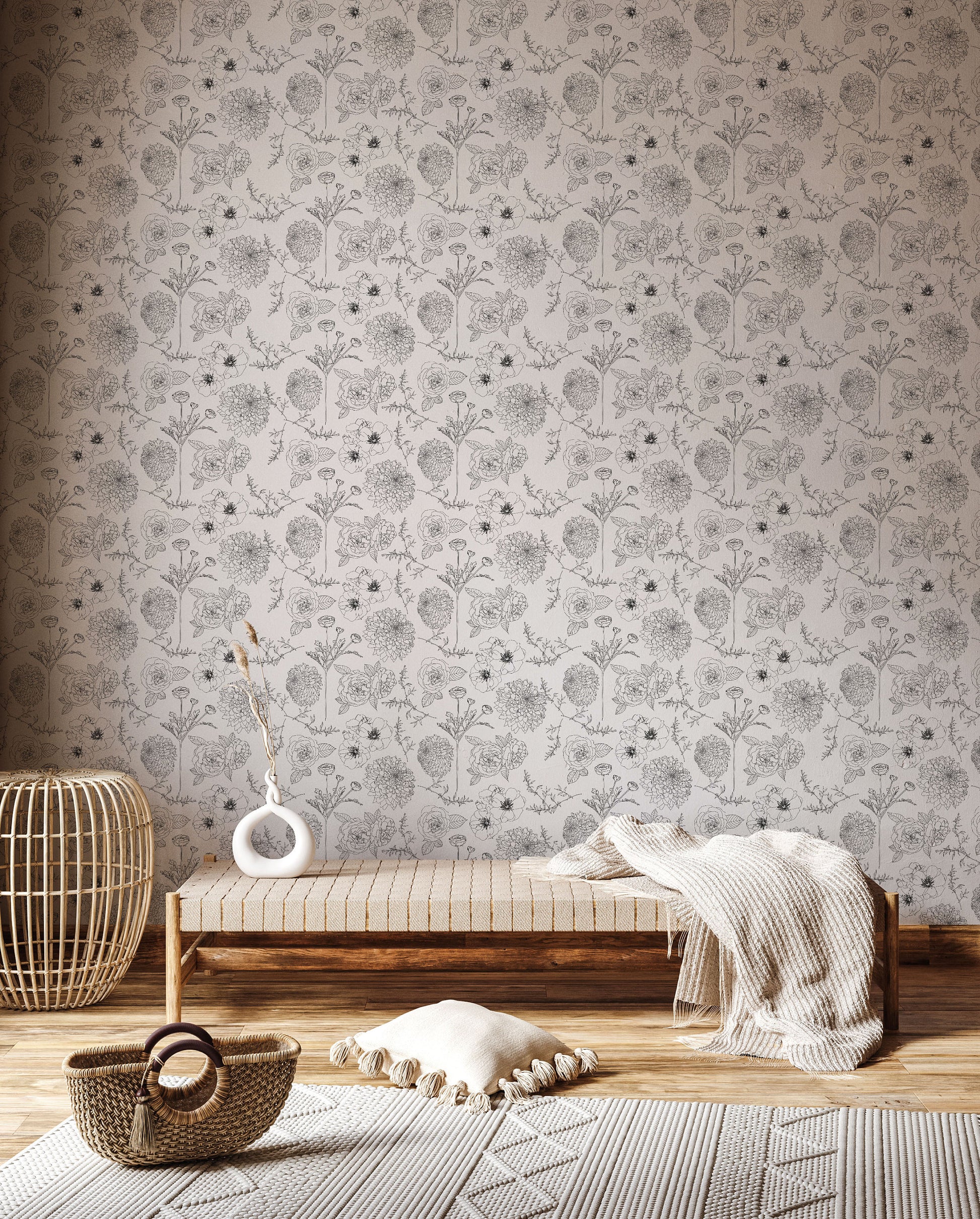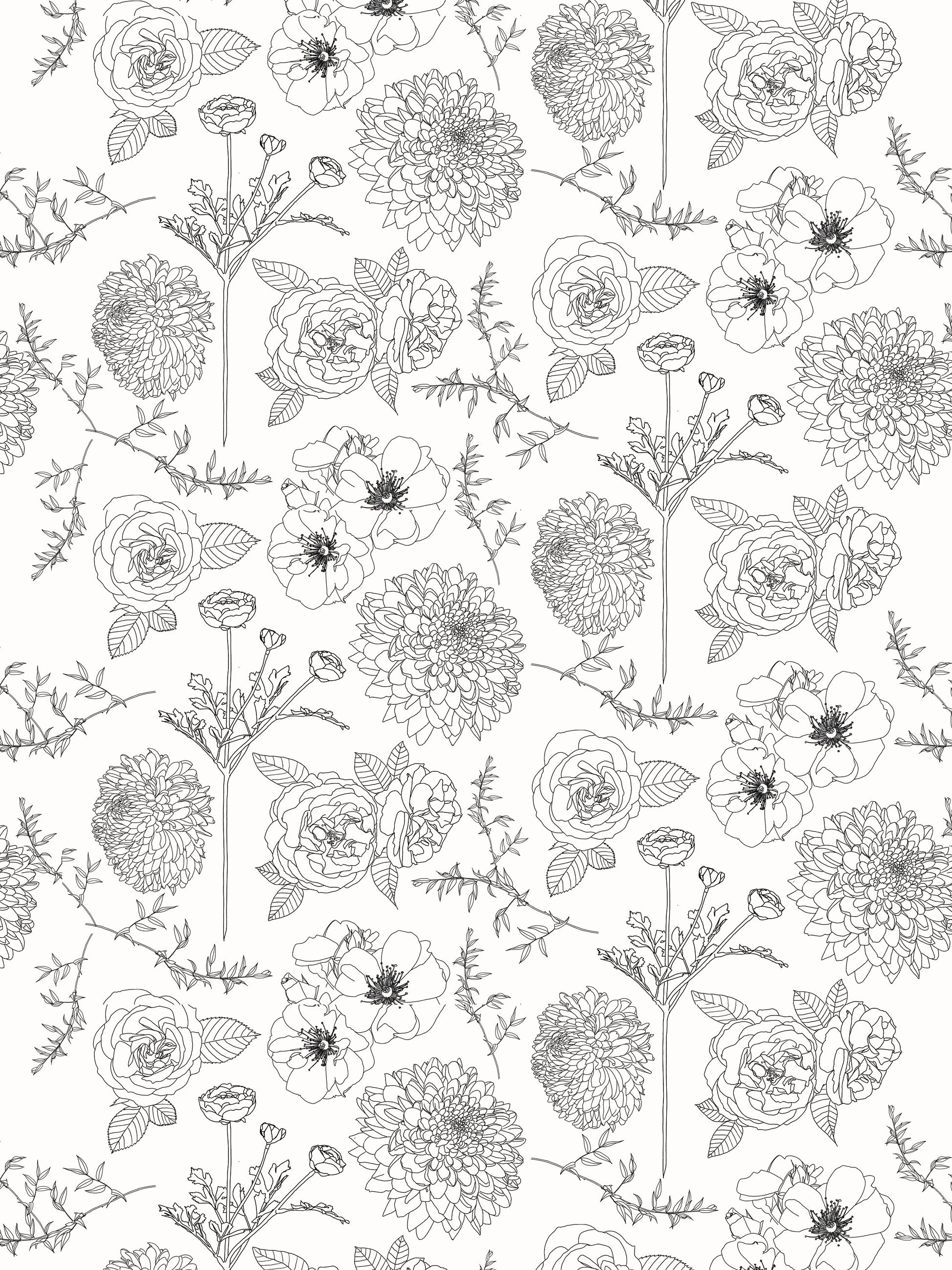 Intricate floral line drawing. All hand drawn in Old Town, Pasadena. Repeats every 18"