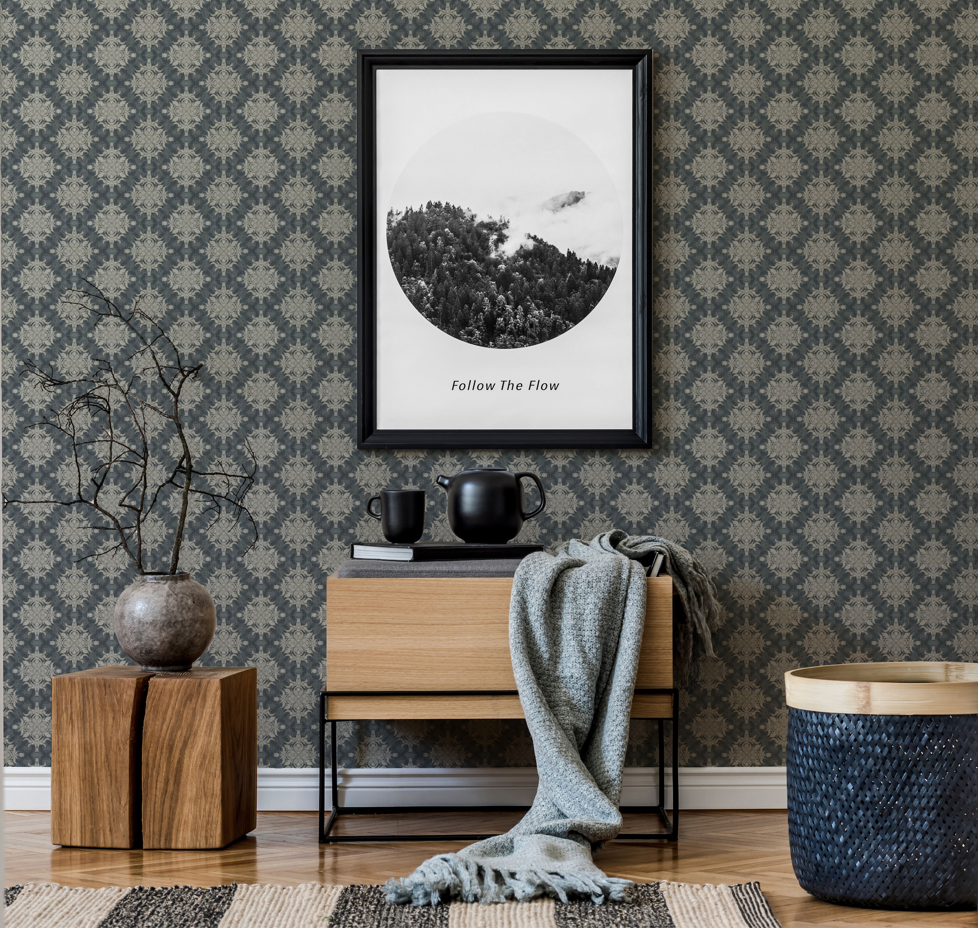 Floral medallion surrounded by a polka dotted trellis. All motifs were hand drawn in Old Town Pasadena.