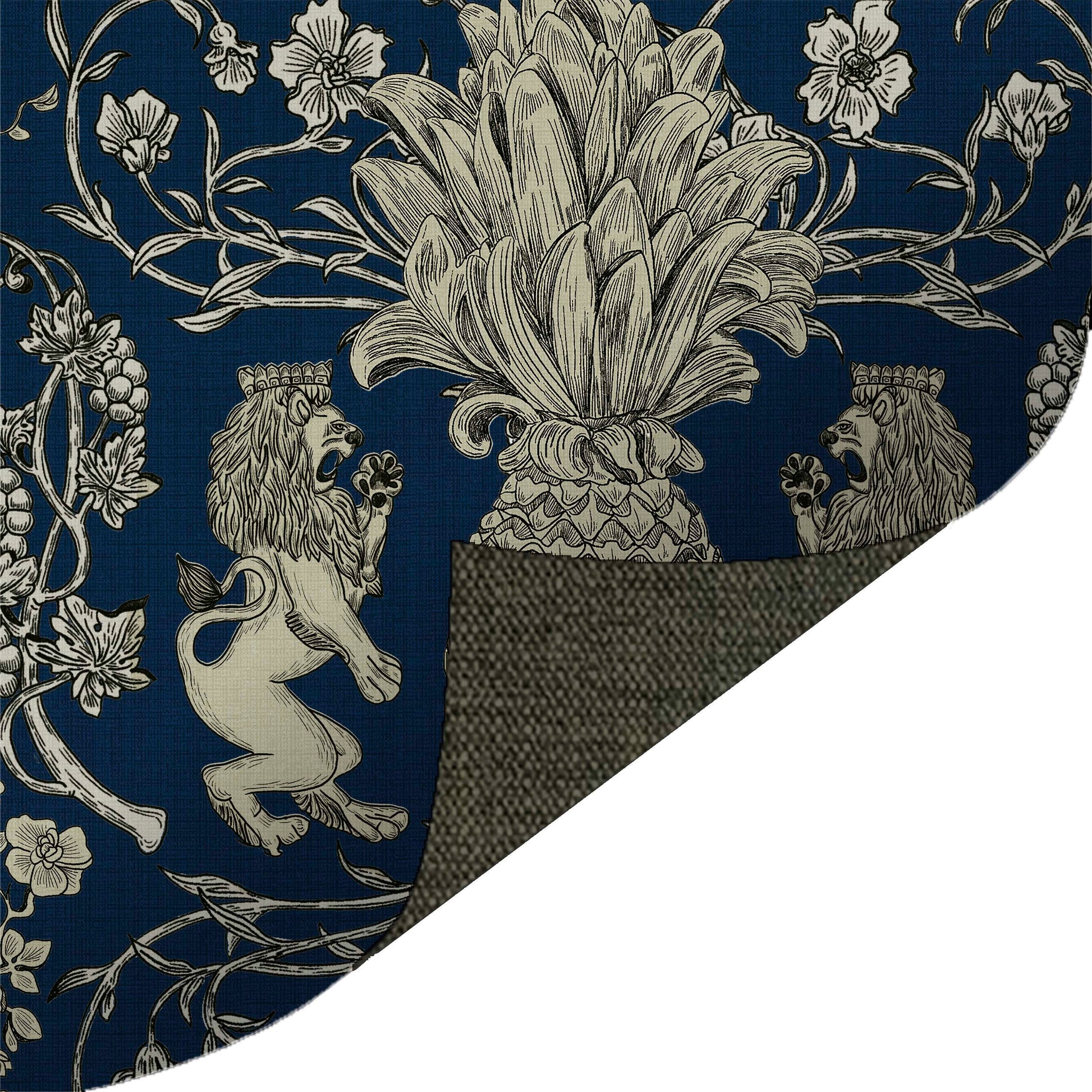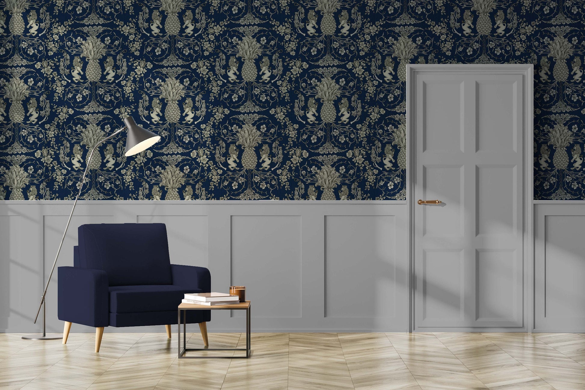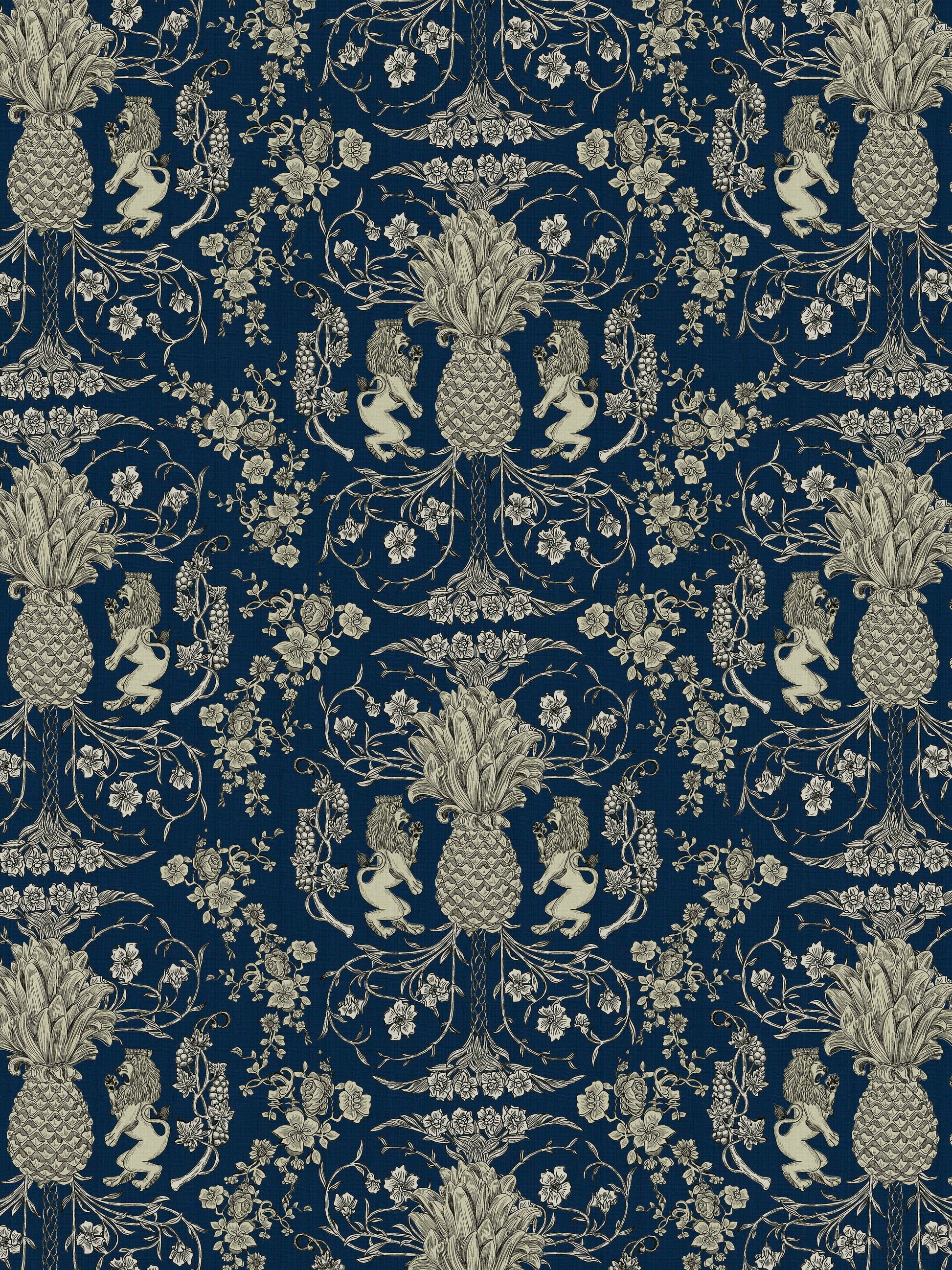Hospitality is a New Orleans inspired wallpaper, they pineapple symbolizes hospitality, the lions make it fancy. All motifs were hand drawn in Old Town Pasadena.