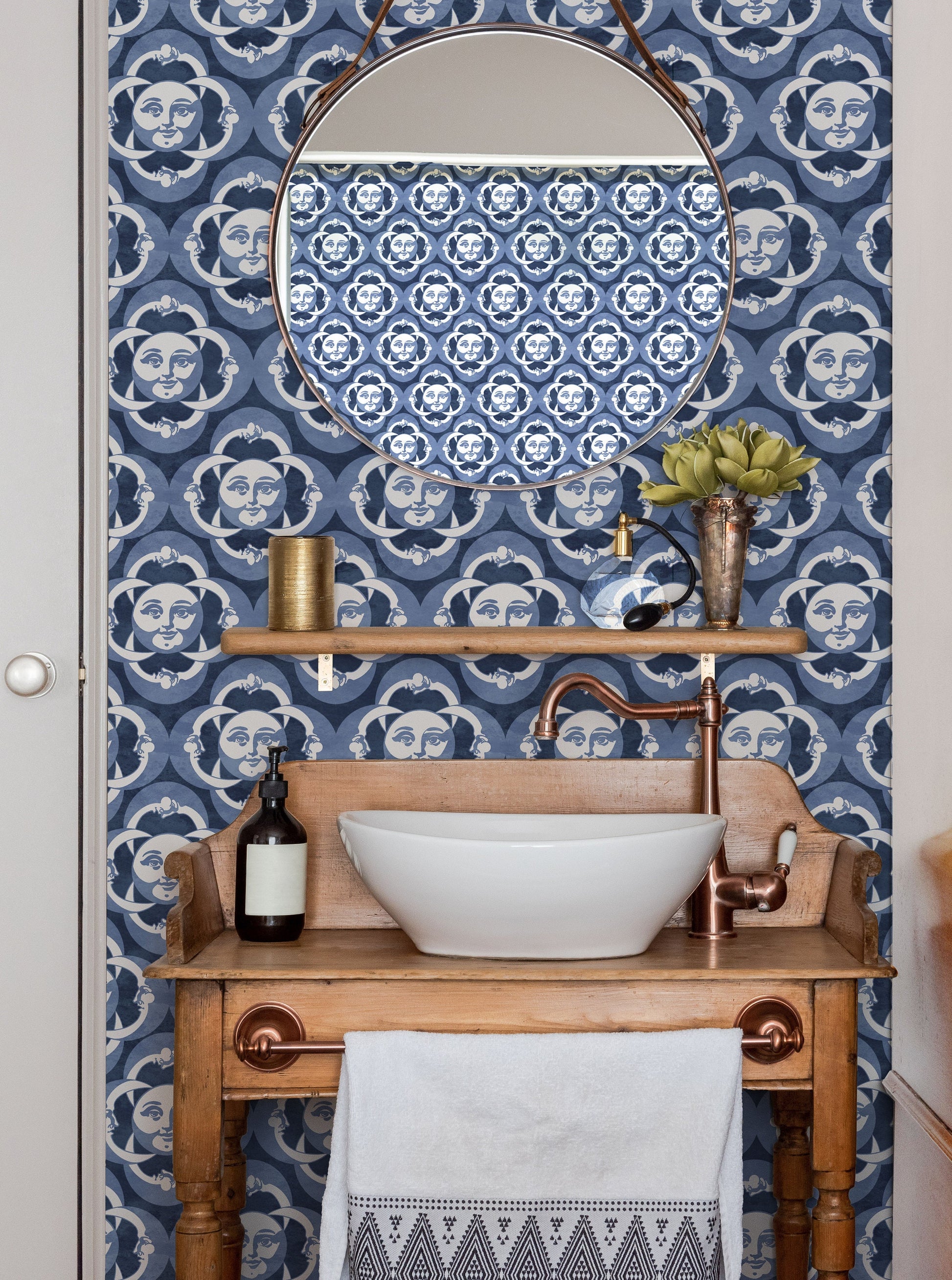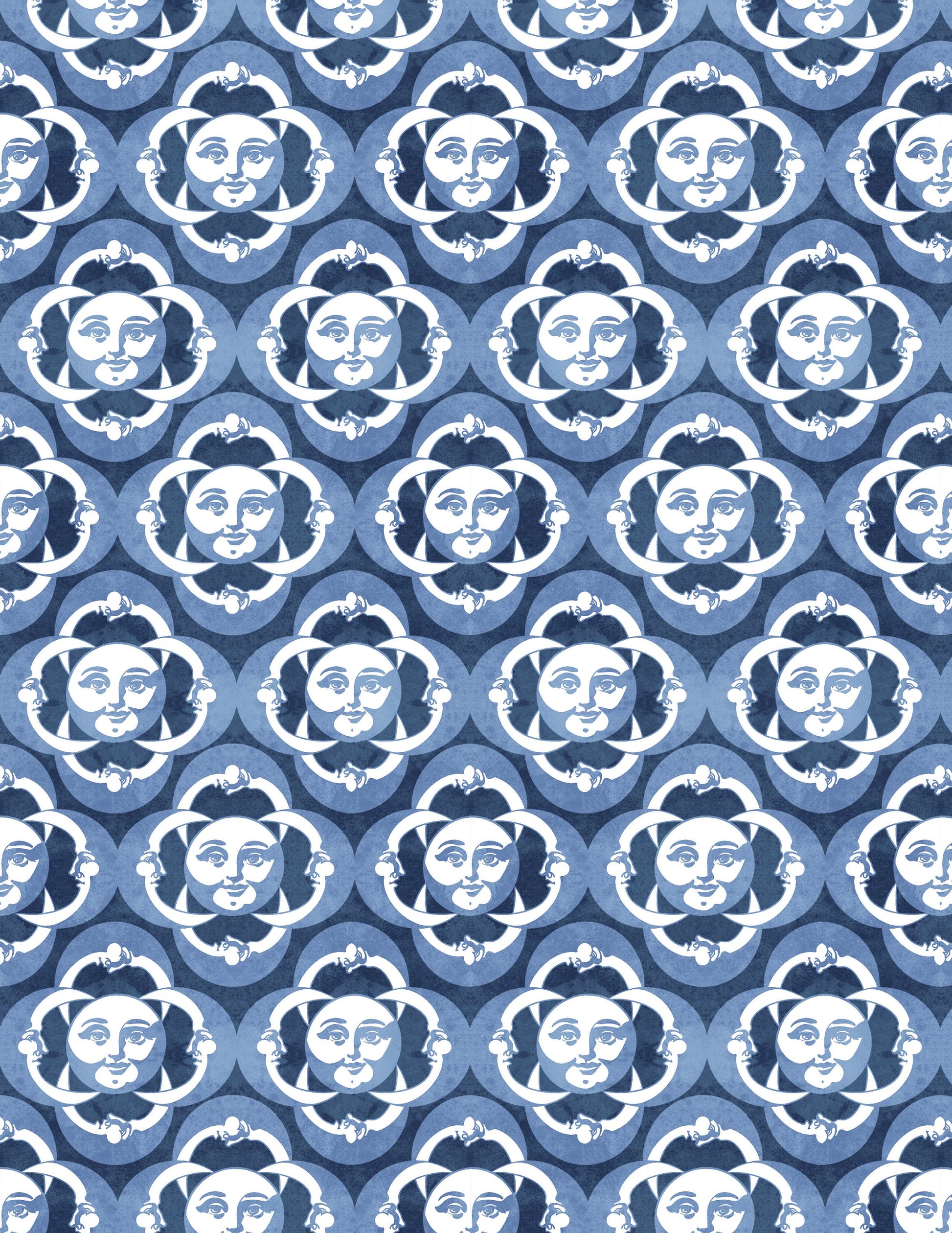 Inspired by La Voyages Dans La Lune, hand drawn moons are tiled out ornate design. All hand drawn in Old Town Pasadena. Repeats every 21"