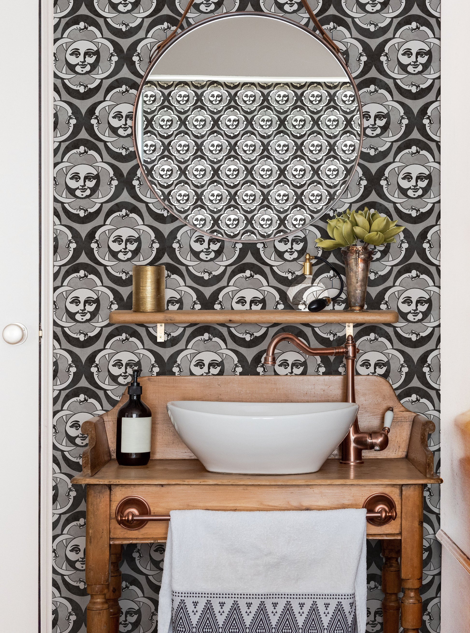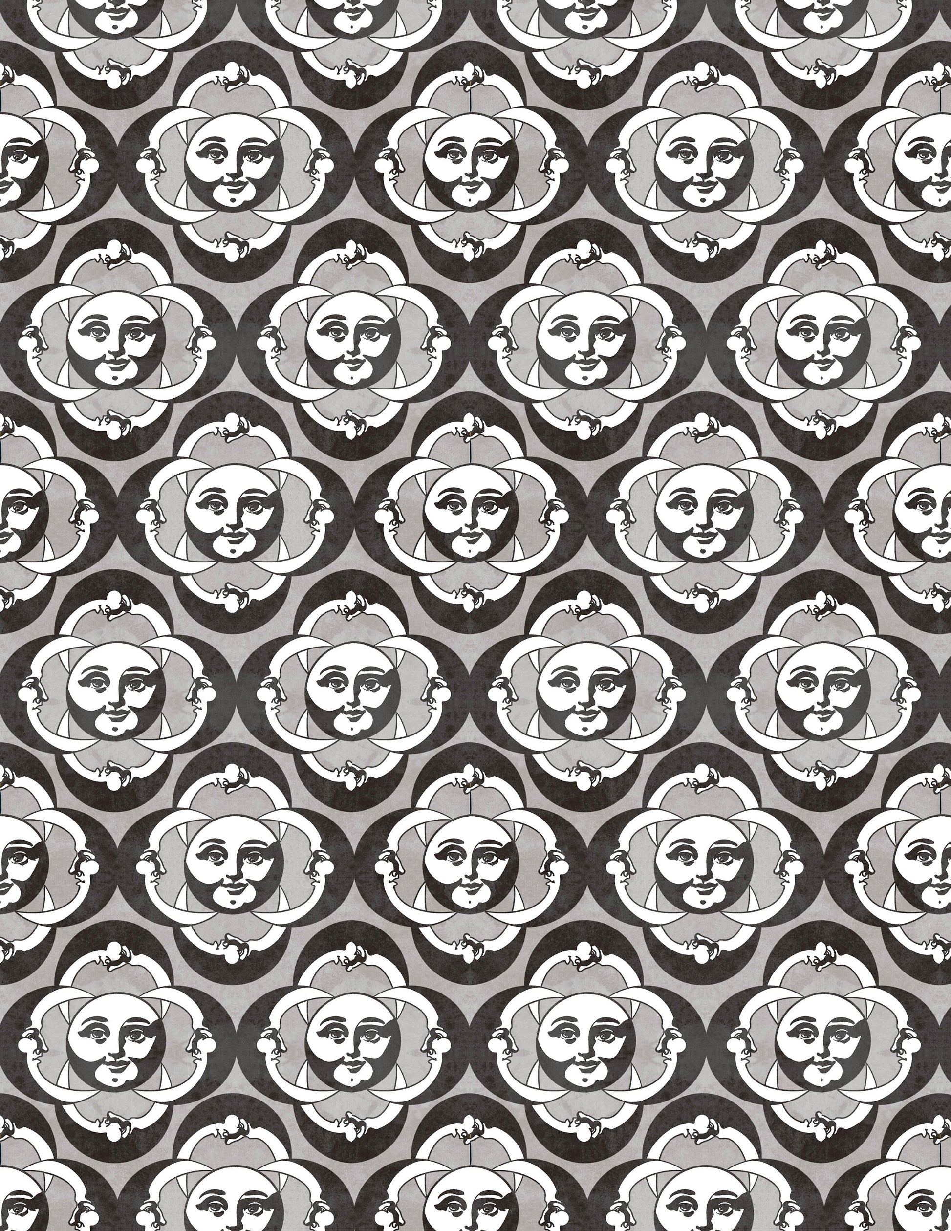 Inspired by La Voyages Dans La Lune, hand drawn moons are tiled out ornate design. All hand drawn in Old Town Pasadena. Repeats every 21"