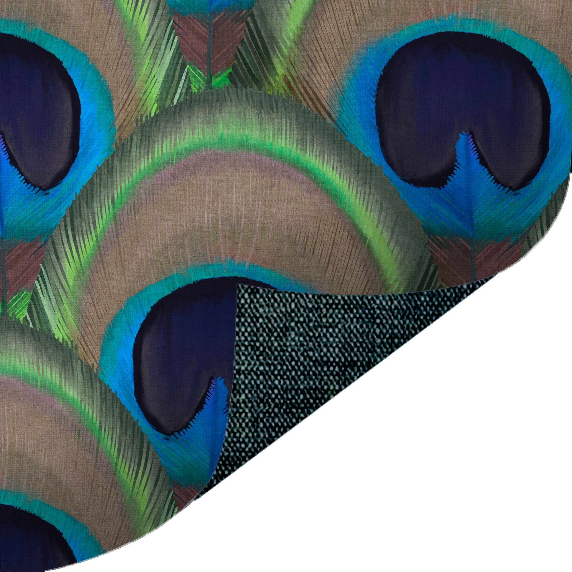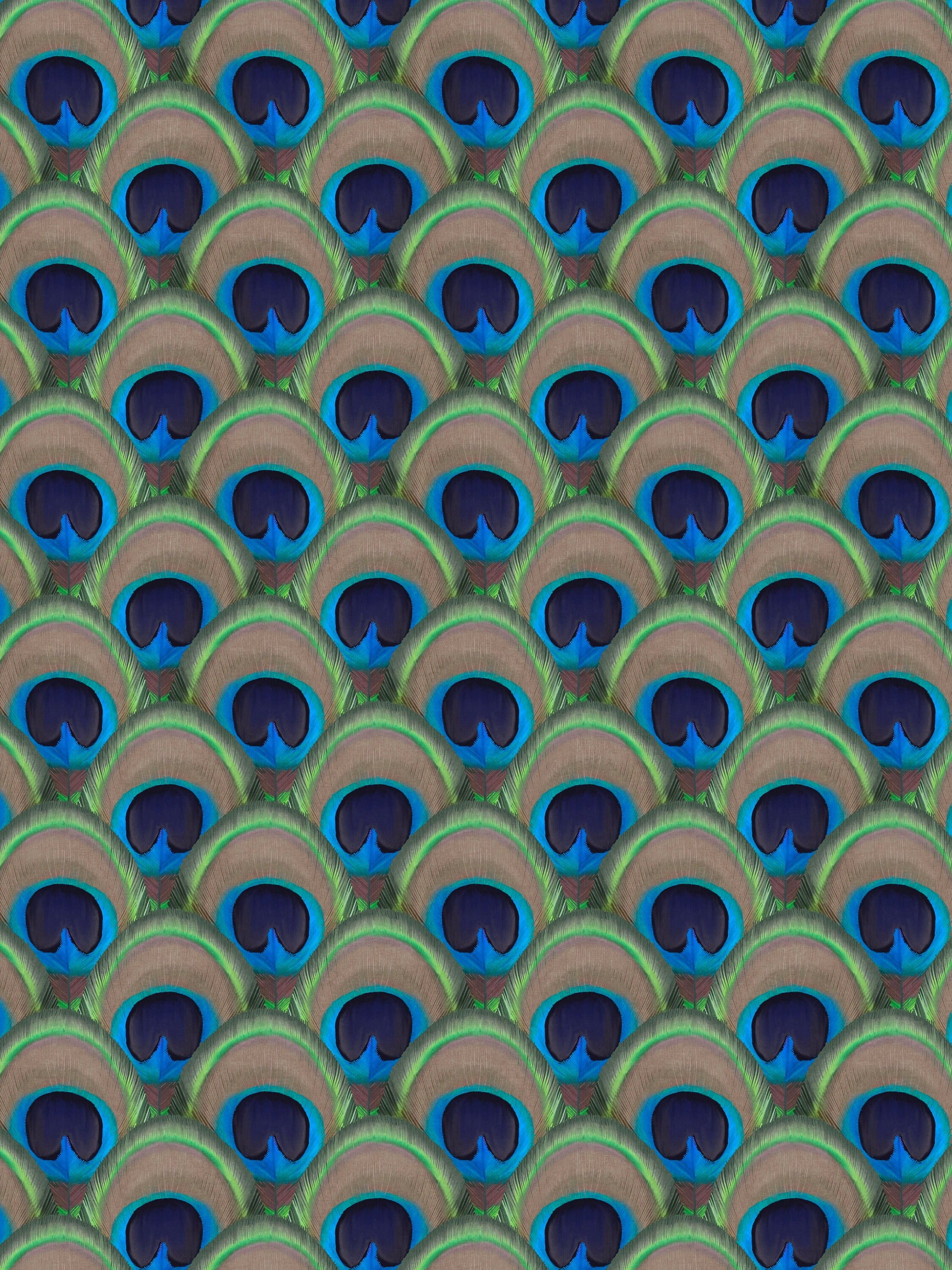 Hyper detailed peacock feathers tiled out for a scalloped look. All hand drawn in Old Town, Pasadena. Repeats every 12"