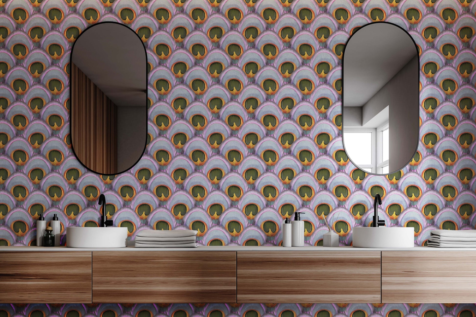 Hyper detailed peacock feathers tiled out for a scalloped look. All hand drawn in Old Town, Pasadena. Repeats every 12"