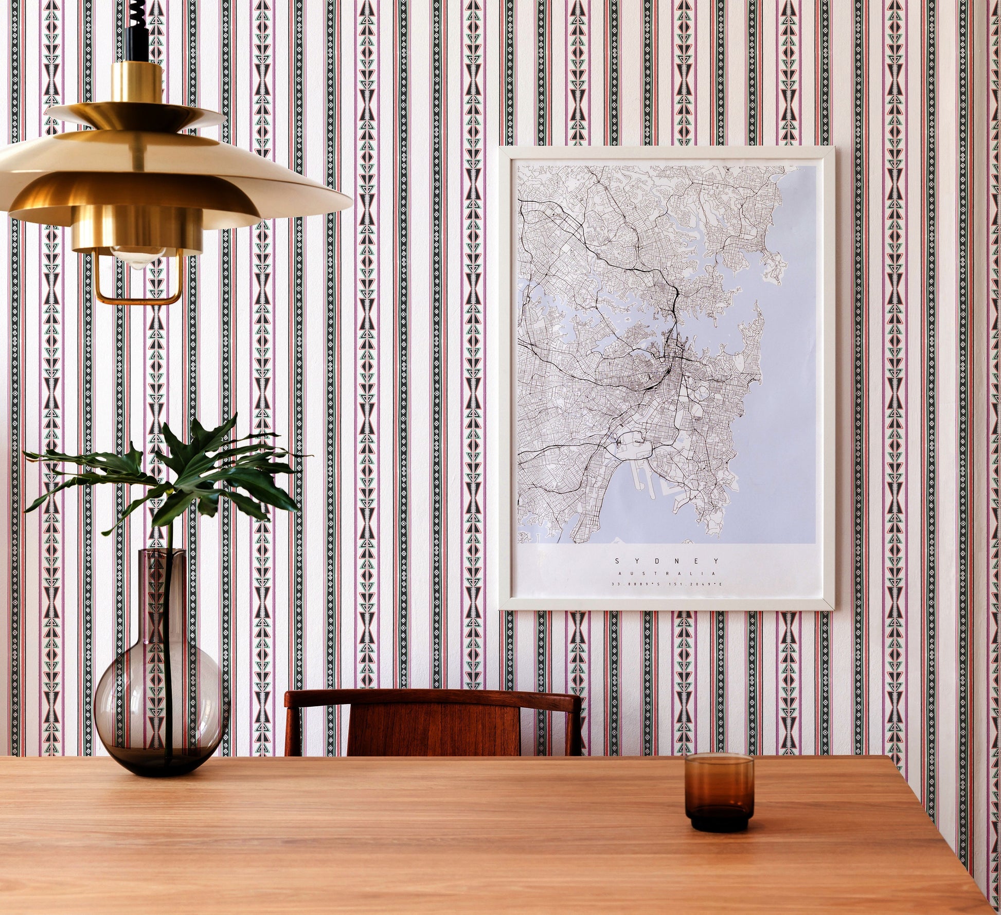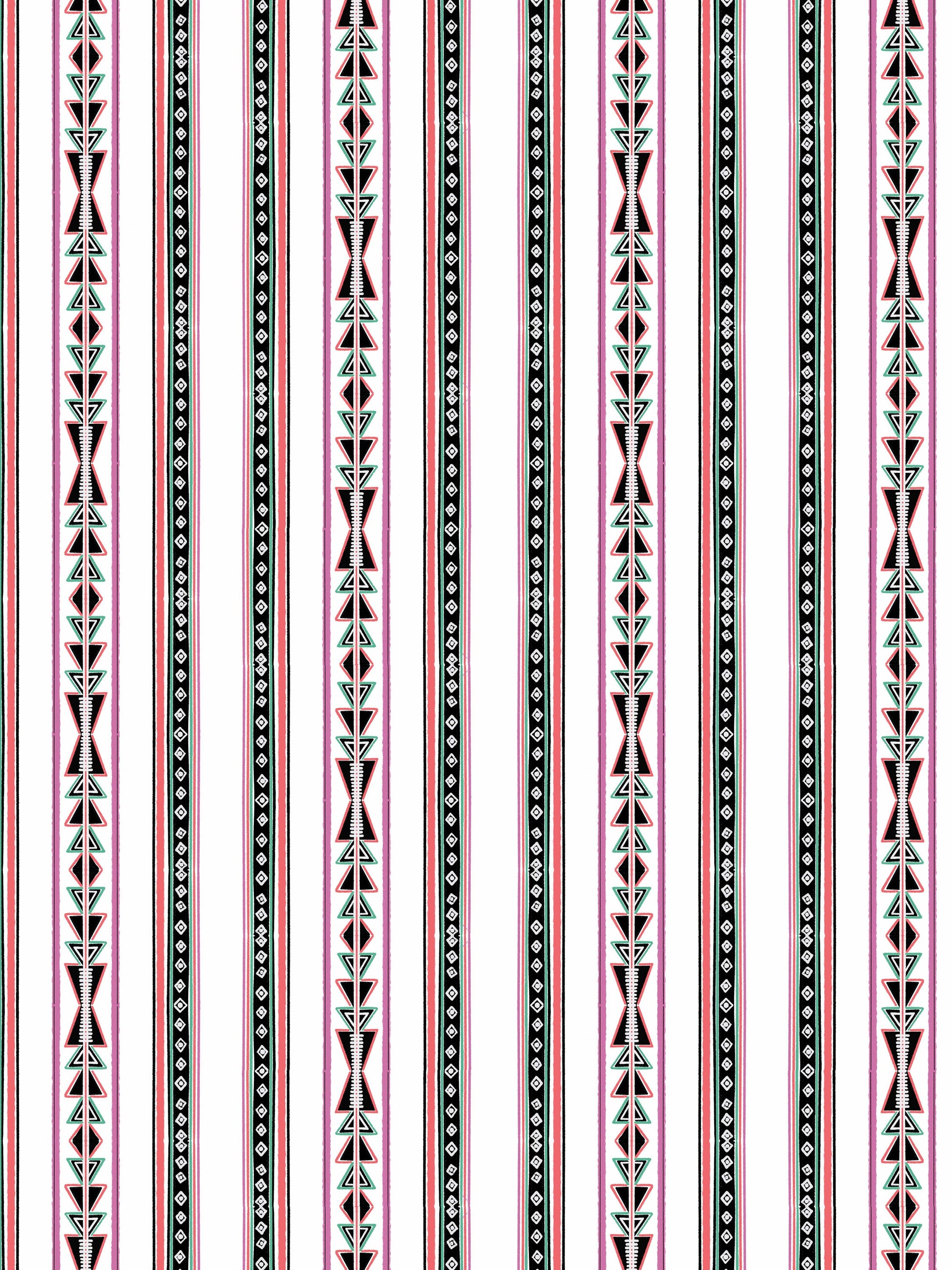 Fun stripe with some tribal motifs. All hand drawn in Old Town, Pasadena. Repeats every 14"